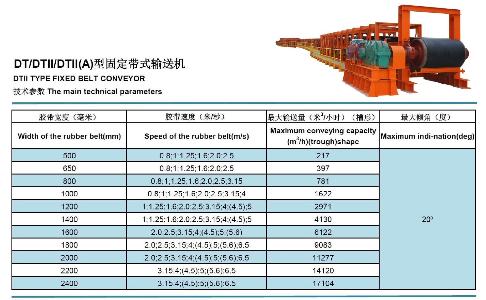 DT/DTII/DTII(A)型固定式带式输送机是高效连续输送设备,与其他运输设备(如机车类)相比,具有生产效率高、输送量大,可实现连续长距离运输,运行费用低等优点。而且运行可靠,易于实现集中自动化控制,可在输送过程中同时完成若干工艺操作。