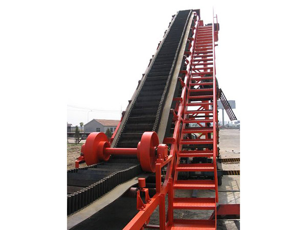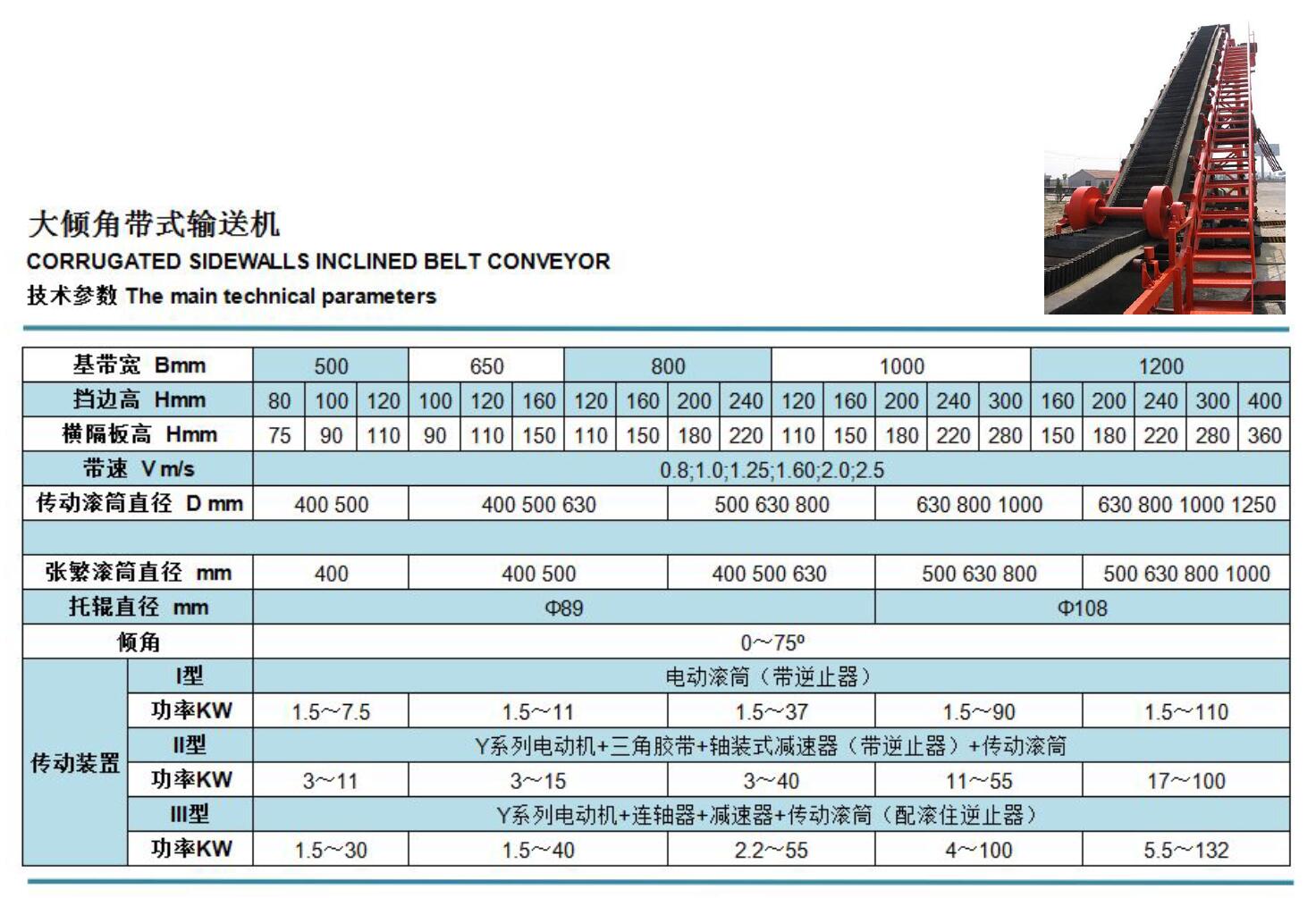 大倾角带式输送机采用具有波状挡边和横隔板的输送带,特别适用于大倾角连续输送的散状物料,具有大量节省设备占地面积、提升高度大等显著优点。