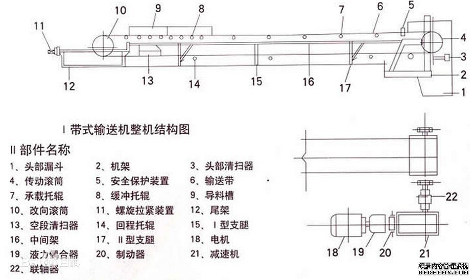带式输送机是一种摩擦驱动以连续方式运输物料的机械。主要由机架、输送带、托辊、滚筒、张紧装置、传动装置等组成。它可以将物料在一定的输送线上,从最初的供料点到最终的卸料点间形成一种物料的输送流程。它既可以进行碎散物料的输送,也可以进行成件物品的输送。除进行纯粹的物料输送外,还可以与各工业企业生产流程中的工艺过程的要求相配合,形成有节奏的流水作业运输线。