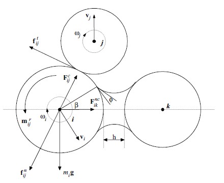 如下图1.1所示,颗粒之间碰撞的力包括法向力和切向力,同时颗粒转动会产生扭转力,如果颗粒非常小需要考虑范德华力,有液体的情况下需要考虑毛细管力等。