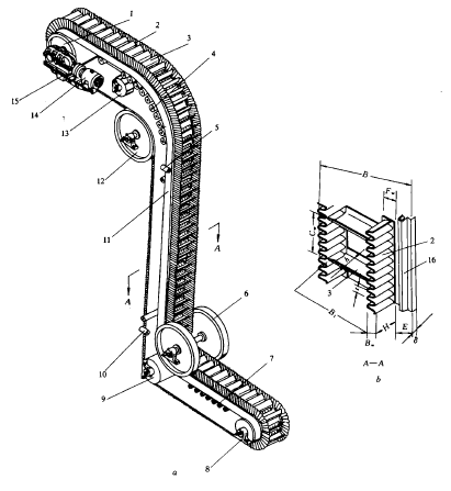 波形挡边带是卸船机的主要工作构件,它具有良好的弯折性能和一定的轴向扭转特性。而且同链斗式提升机和输送带斗提升机相比,波形挡边带的自重轻,工作速度可高达2~3.5m/s,而链斗式提升机工作速度一般在1.4 m/s左右。