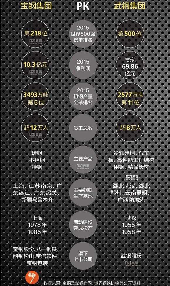 宝钢集团与武钢集团均属于国资委直接管理的中央企业。武钢集团位于武汉的生产基地1955年开始建设,1958年建成投产,是新中国成立后兴建的首家特大型钢铁联合企业。而宝钢集团在上海的工厂1978年才启动建设,1985年正式投产。